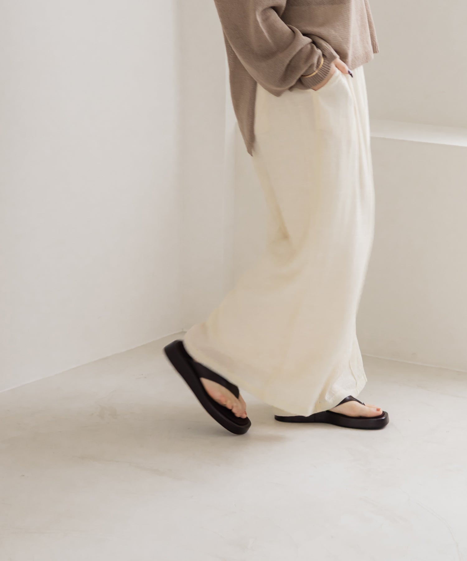 ウエストは総ゴム仕様に、さりげないゴールドのアクセントを添えて、ラフさの中に、上品さを。