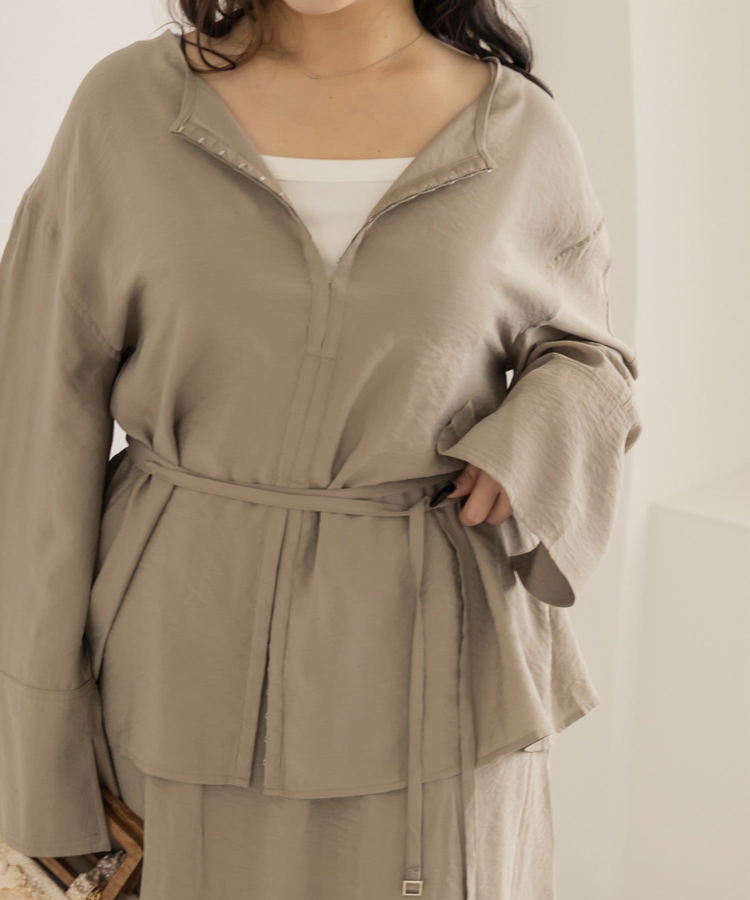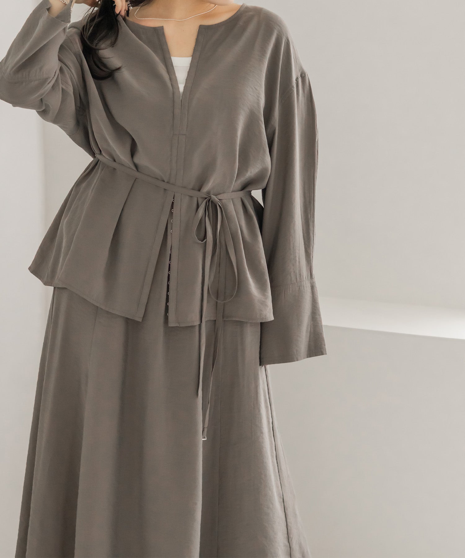 襟元の開きや裾のニュアンスは、ホックやウエストリボンで自由に調整可能。